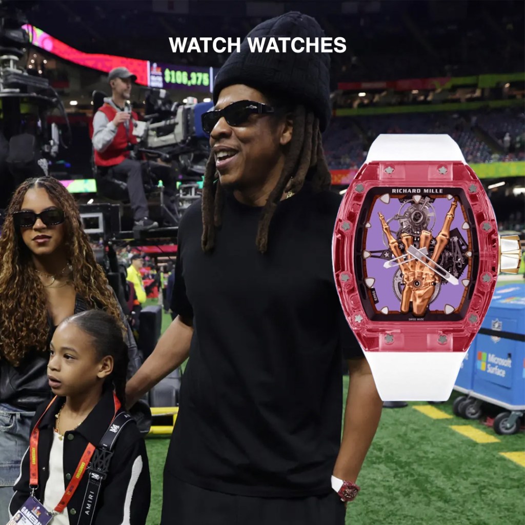 不過,超級盃的亮點可不只這些!每次都會吸引大批名人到場,而Jay-Z這次佩戴的腕錶更是成為全場焦點✨——Richard Mille RM66 Flying Tourbillon,獨特的紅橙藍水晶錶殼,是Richard Mille最稀有的材質之一,定價高達$3,500,000美金(約港幣27,261,000)!